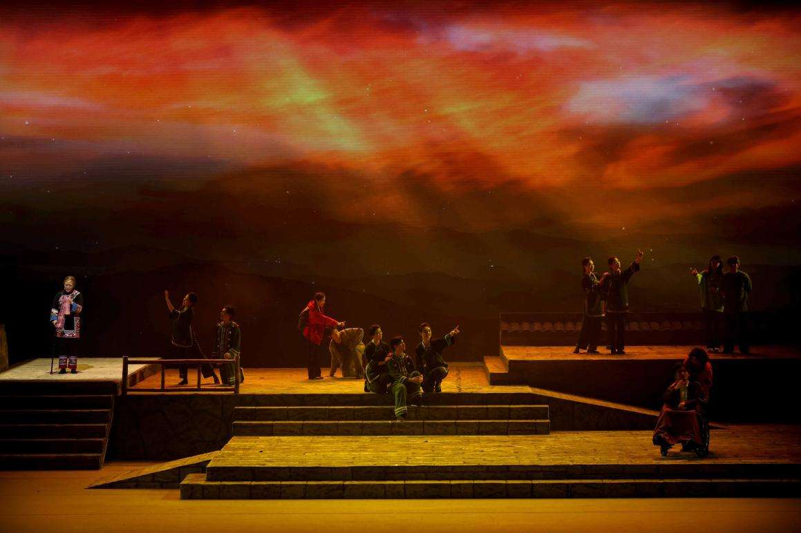 在艺术呈现上,作品巧妙运用1944年与2025年双时空交织的叙事结构,将畲族文化传统、抗战历史记忆、英士大学办学史与浙南山乡独特风貌融入叙事。作品深度融合畲族文化元素。剧中蓝翠翠的唱腔保留了畲族山歌特有的颤音节奏,村民的集体舞蹈严格复刻了畲族“踏步摆腰”的传统动作,舞台上的每个画面都在诉说着浓浓的民族风情。